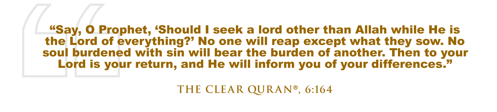 The Quran makes something very clear when it says, “Say, O Prophet, ‘Should I seek a lord other than Allah while He is the Lord of everything?’ No one will reap except what they sow. No soul burdened with sin will bear the burden of another. Then to your Lord is your return, and He will inform you of your differences.” (The Clear Quran®, 6:164)