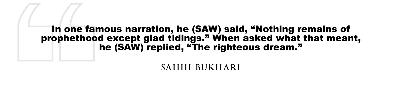 The Prophet (SAW) himself would ask his companions after Fajr prayers if any of them had seen a dream. He (SAW) would listen and, at times, interpret their dreams. In one famous narration, he (SAW) said, “Nothing remains of prophethood except glad tidings.” When asked what that meant, he (SAW) replied, “The righteous dream.” (Sahih Bukhari)