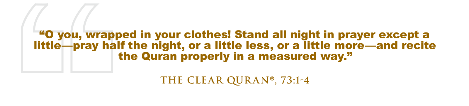 It is foundational to The Quranic vision of spiritual refinement and nearness to Allah (SWT). In fact, one of the earliest commands revealed to the Prophet (SAW) came in the form of an injunction to pray during the night. The beginning of Surah Al-Muzammil, widely acknowledged as among the earliest revelations chronologically, opens with the address, “O you, wrapped in your clothes! Stand all night in prayer except a little—pray half the night, or a little less, or a little more—and recite the Quran properly in a measured way.” (The Clear Quran®, 73:1-4)