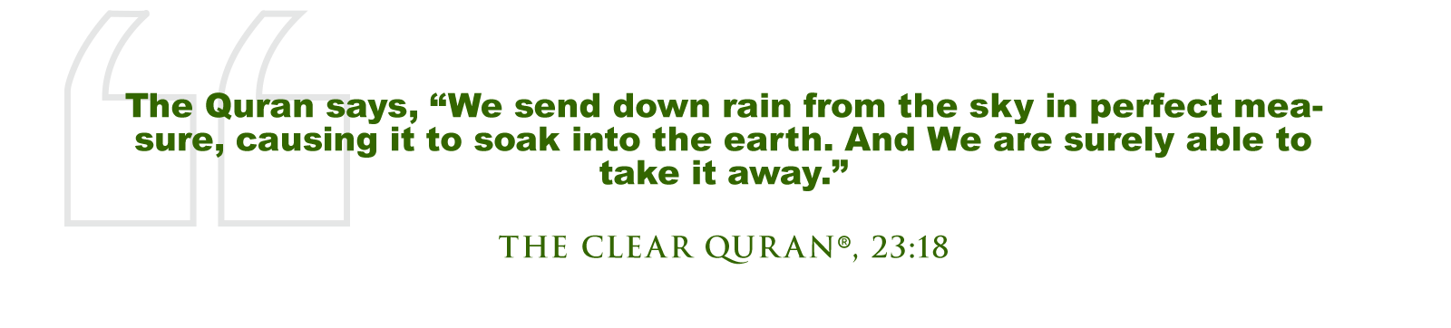 The Quran says, “We send down rain from the sky in perfect measure, causing it to soak into the earth. And We are surely able to take it away.” (The Clear Quran®, 23:18)