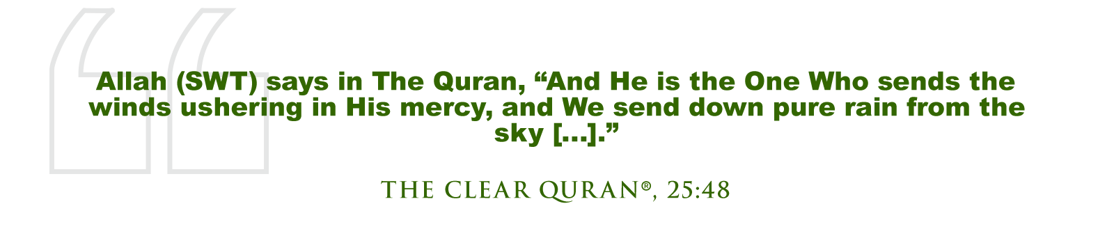 Allah (SWT) says in The Quran, “And He is the One Who sends the winds ushering in His mercy, and We send down pure rain from the sky […].” (The Clear Quran®, 25:48)