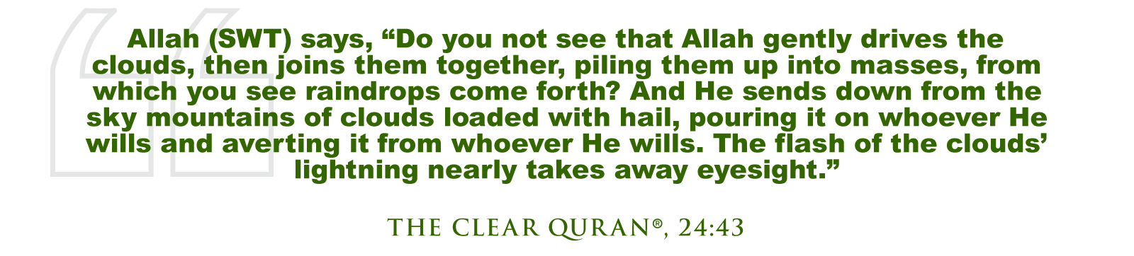Allah (SWT) says, “Do you not see that Allah gently drives the clouds, then joins them together, piling them up into masses, from which you see raindrops come forth? And He sends down from the sky mountains of clouds loaded with hail, pouring it on whoever He wills and averting it from whoever He wills. The flash of the clouds’ lightning nearly takes away eyesight.” (The Clear Quran®, 24:43)