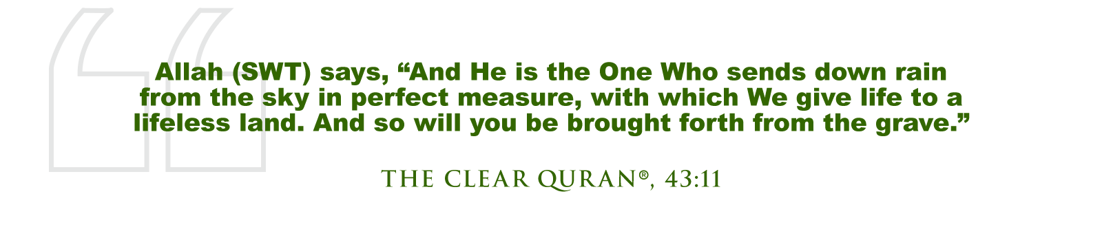 Were it larger, it would split mid-air. Were it smaller, it might evaporate before reaching the earth. The Quran confirms that all of this happens with divine measurement. Allah (SWT) says, “And He is the One Who sends down rain from the sky in perfect measure, with which We give life to a lifeless land. And so will you be brought forth from the grave.” (The Clear Quran®, 43:11)