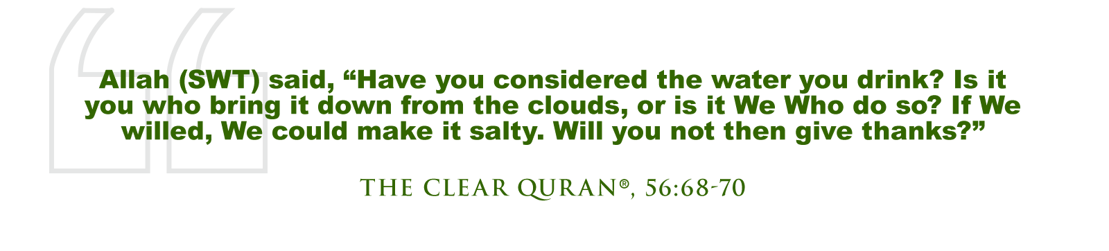 Allah (SWT) said, “Have you considered the water you drink? Is it you who bring it down from the clouds, or is it We Who do so? If We willed, We could make it salty. Will you not then give thanks?” (The Clear Quran®, 56:68-70)
