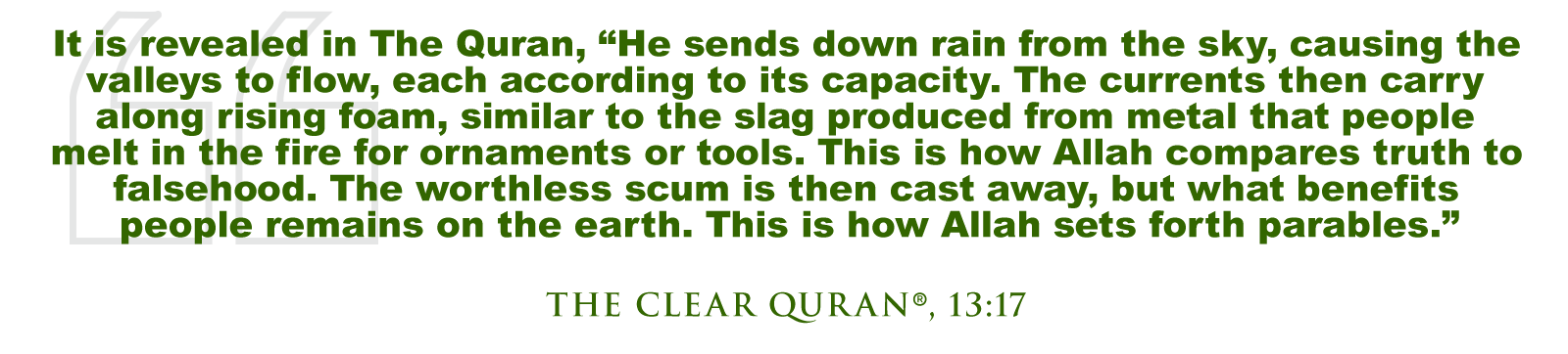 It is revealed in The Quran, “He sends down rain from the sky, causing the valleys to flow, each according to its capacity. The currents then carry along rising foam, similar to the slag produced from metal that people melt in the fire for ornaments or tools. This is how Allah compares truth to falsehood. The worthless scum is then cast away, but what benefits people remains on the earth. This is how Allah sets forth parables.” (The Clear Quran®, 13:17)
