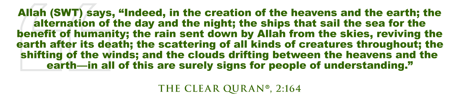 Allah (SWT) says, “Indeed, in the creation of the heavens and the earth; the alternation of the day and the night; the ships that sail the sea for the benefit of humanity; the rain sent down by Allah from the skies, reviving the earth after its death; the scattering of all kinds of creatures throughout; the shifting of the winds; and the clouds drifting between the heavens and the earth—in all of this are surely signs for people of understanding.” (The Clear Quran®, 2:164)